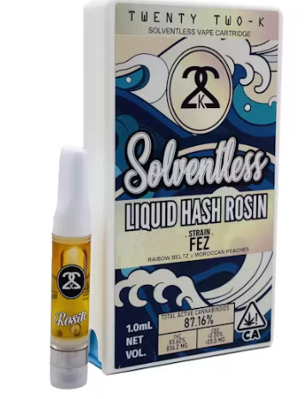 TWENTYTWO-K - LIQUID HASH ROSIN Crafted from premium, flash-frozen whole-plant cannabis, our Liquid Hash Rosin delivers a flavorful potent punch. Every small-batch release is packed with full-spectrum terpenes and living cannabinoids, ensuring a smooth, and true-to-strain experience. All ceramic and glass cartridges guarantee a clean, pure vapor with no additives, just the highest quality cannabis in its most natural form. Made in small batches. Pure Plant, Full Experience.