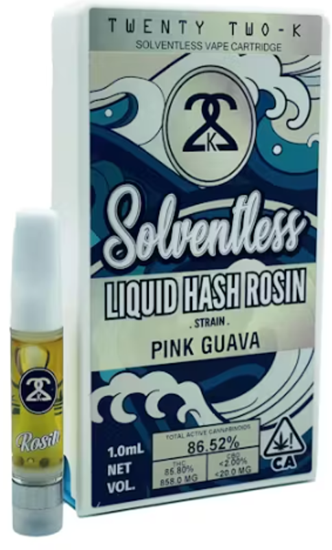TWENTYTWO-K - LIQUID HASH ROSIN Crafted from premium, flash-frozen whole-plant cannabis, our Liquid Hash Rosin delivers a flavorful potent punch. Every small-batch release is packed with full-spectrum terpenes and living cannabinoids, ensuring a smooth, and true-to-strain experience. All ceramic and glass cartridges guarantee a clean, pure vapor with no additives, just the highest quality cannabis in its most natural form. Made in small batches. Pure Plant, Full Experience.
