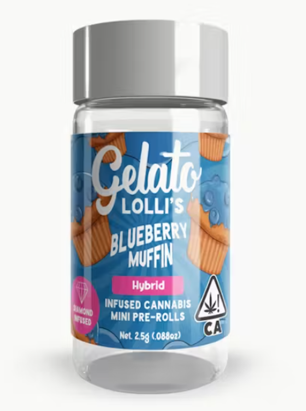 Blueberry Muffin is a hybrid strain that is indica leaning. This 5pk of mini-infused pre rolls has the signature smell of freshly baked muffins followed by a sweetness taste with a smooth creamy finish. These artisanal products are designed to advance the evolution of the Cannabis industry into mainstream with a bit of colorful fun. The Gelato Brand and Family have a motto, "Do what is right over what is easy!". Flavors Blueberry Sweet Earthy Effects & flavors are reported by users on our site. This is for informational purposes only and not intended as medical advice. Please consult your physician before changing any medical treatment.