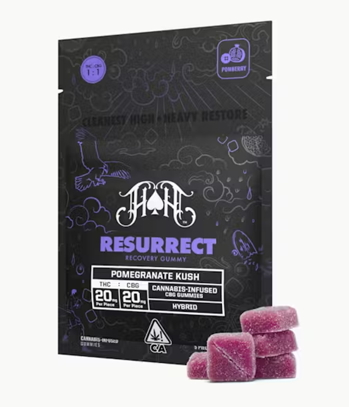 Heavy Hitters honors the indomitable spirit of cannabis by creating a potent, rare cannabinoid remedy designed to support a calm and relaxed state of mind, promote energy levels, and maintain overall comfort. Introducing the Heavy Hitters Resurrect CBG Recovery Gummy. This maxed-out gummy features a 1:1 ratio of THC and CBG, crafted for those seeking a renewed sense of well-being and inner strength. Powered by bold pomberry flavors and Pomegranate Kush, these hybrid gummies deliver a surge of comfort and perfect relaxation. Each 20mg gummy is a testament to resilience, designed to help you bounce back and find balance. Step out of the ring, recoup, and resurrect with Heavy Hitters CBG Gummies. Terpene Blend: Terpinolene, Myrcene, Limonene STRAIN TYPE / PHENOTYPE: Hybrid FLAVOR PROFILE: Pomegranate, Berry This statement has not been evaluated by the Food and Drug Administration. This product is not intended to diagnose, treat, cure, or prevent any disease.