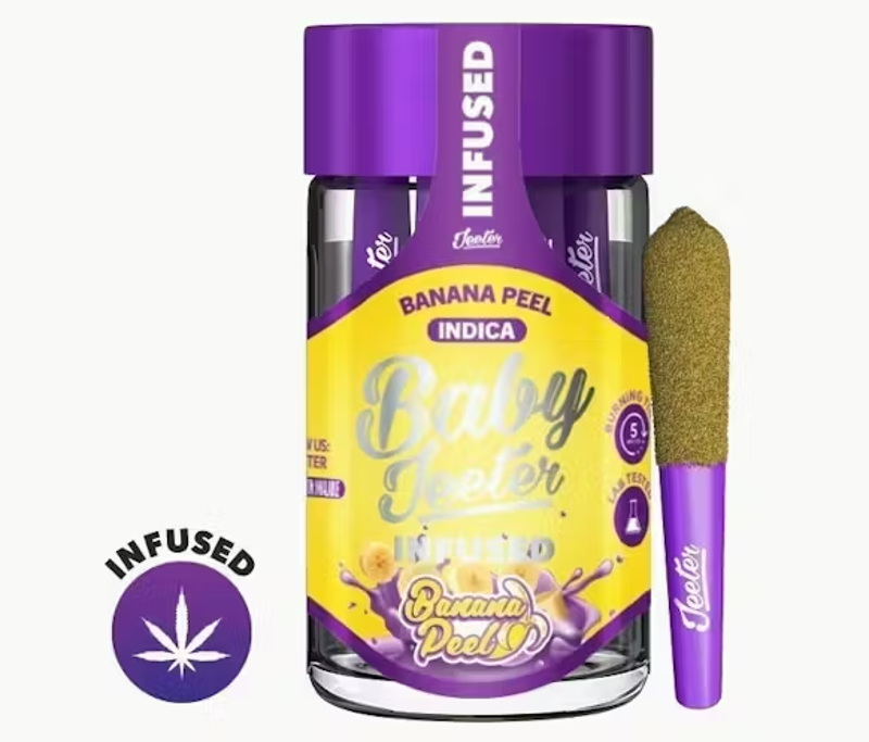 Banana Peel Baby Jeeter Infused - Five .5g Joints 2.5g | Indica | 41.58% THC Indoor Grown Infused with Distillate Oil & Kief At the core of Jeeter is our Culture .. a culture of love, passion and innovation. We value relationships and the culture of our company can been seen in everything we do from our products, to our brands, to our facilities, to our love for our customers and each other. Flavors Diesel Earthy Pepper Effects & flavors are reported by users on our site. This is for informational purposes only and not intended as medical advice. Please consult your physician before changing any medical treatment.