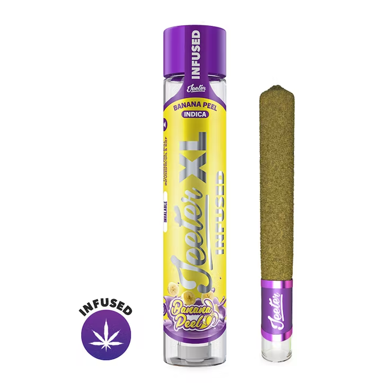 Users report feeling relaxed with this high potency product. 41.58% THC Relaxed Happy Euphoric Banana Peel Jeeter XL Infused Rolled Joint: 2g Joint | Indica | 41.58% THC Indoor Grown Infused with Distillate Oil & Kief Mood: relaxed,happy,euphoric This legendary West Coast strain crosses Ghost OG and Skunk Haze to create an indica that tastes and smells like a bushel of fresh bananas. Banana Peel tends to provide a mellow buzz alongside a relaxed sense of euphoria. It also helps stimulate your creative juices and can help you remain talkative in social settings. Flavors Sweet Tropical Woody Effects & flavors are reported by users on our site. This is for informational purposes only and not intended as medical advice. Please consult your physician before changing any medical treatment.