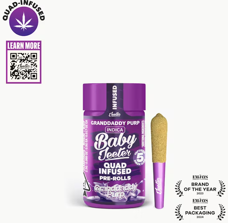 Granddaddy Purp | Baby Jeeter | Indica 5 x 0.5G Joints 2.5G Total Quad-Infused | Premium Flower Infused with THCa Diamonds, Rosin, & Kief Flavors Grape Berry Spicy/Herbal Effects & flavors are reported by users on our site. This is for informational purposes only and not intended as medical advice. Please consult your physician before changing any medical treatment.
