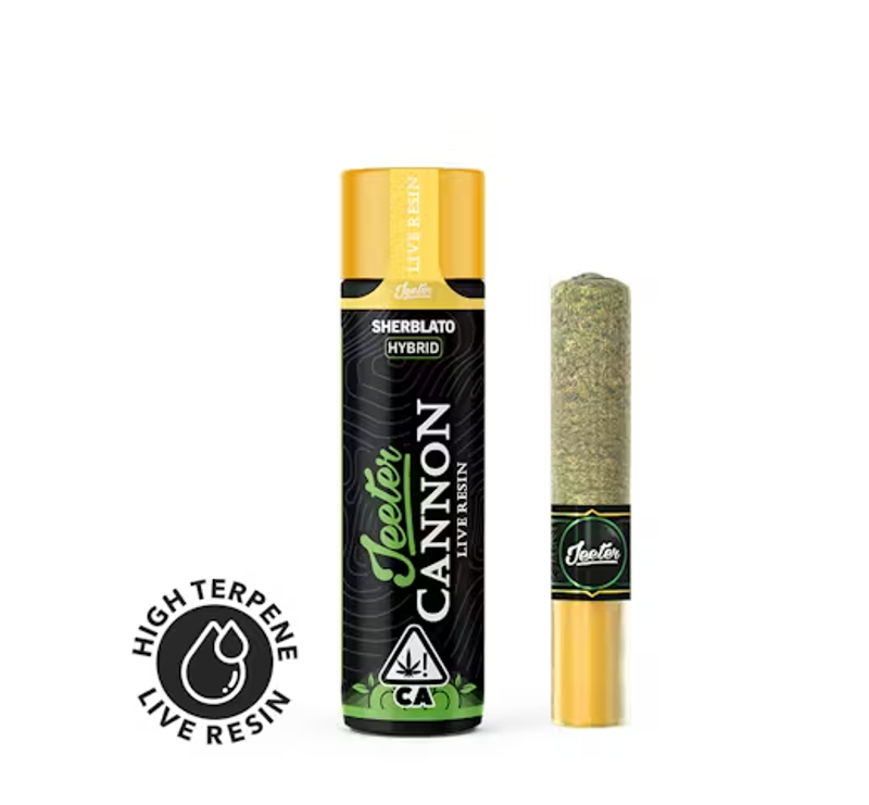 Sherblato Jeeter Cannon Live Resin: 1.3G Joint | Hybrid | Premium Flower Infused w/ Live Resin Flavors Sweet Berry Ammonia Effects & flavors are reported by users on our site. This is for informational purposes only and not intended as medical advice. Please consult your physician before changing any medical treatment.