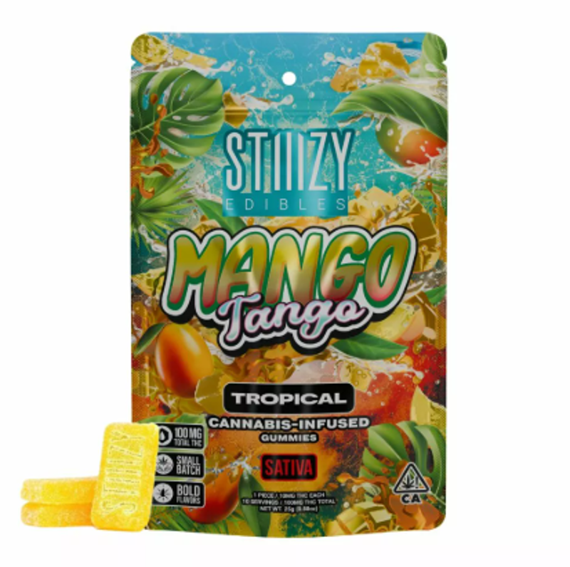 100MG GUMMIES - MANGO TANGO - SATIVA · Taste: Mango, Citrus, Tropical · Feeling: Energized, Happy, Creative · Description: Mango Tango is an energetic sativa blends sweet and tangy flavors that is a blast! Introducing our new line of Stiiizy edibles. Your favorite live resin infused gummies are formulated with fast-acting nanotechnology in 10 mg pieces. Enjoy the blend of both delicious and mouth watering flavors in every bite. - 100MG Total THC - 10MG Per Piece - Segmented into Ten 10MG Servings - Fast-acting Nano-molecular Enhanced - Made with Live Resin Gummies Citrus Creative Energetic Happy Mango Sativa THC Tropical
