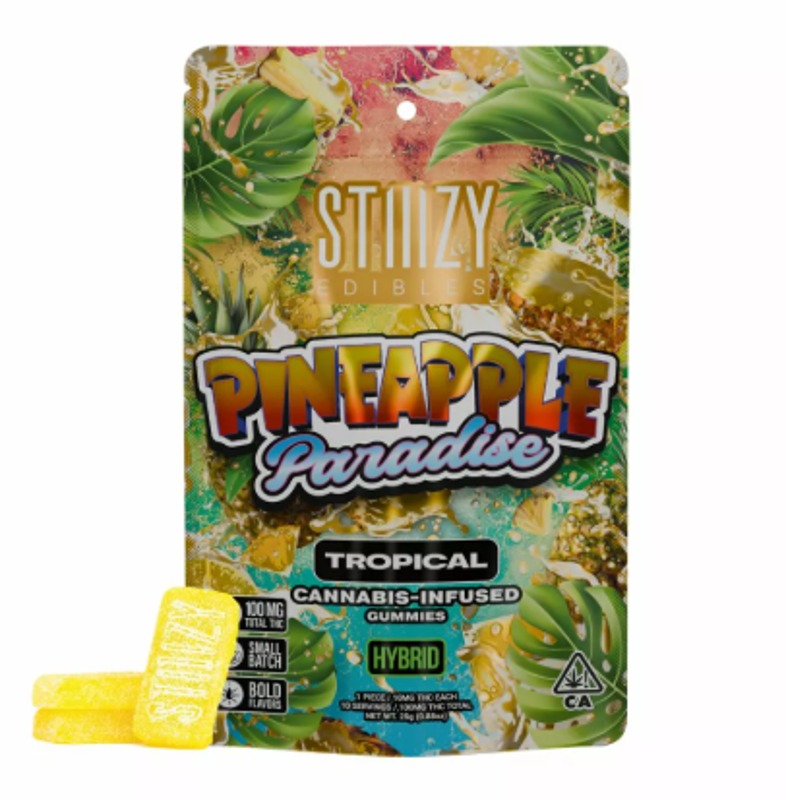 100MG GUMMIES - PINEAPPLE PARADISE - HYBRID · Taste: Tropical, Pineapple, Citrus · Feeling: Relaxed, Happy, Euphoric · Description: Paradise has been found with this relaxing and euphoric treat! This hybrid-dominant gummy gives your taste buds a tropical mix of pineapple and citrus. Introducing our new line of Stiiizy edibles. Your favorite live resin infused gummies are formulated with fast-acting nanotechnology in 10 mg pieces. Enjoy the blend of both delicious and mouth watering flavors in every bite. - 100MG Total THC - 10MG Per Piece - Segmented into Ten 10MG Servings - Fast-acting Nano-molecular Enhanced - Made with Live Resin Gummies Citrus Euphoric Happy Hybrid Pineapple Relaxed THC Tropical